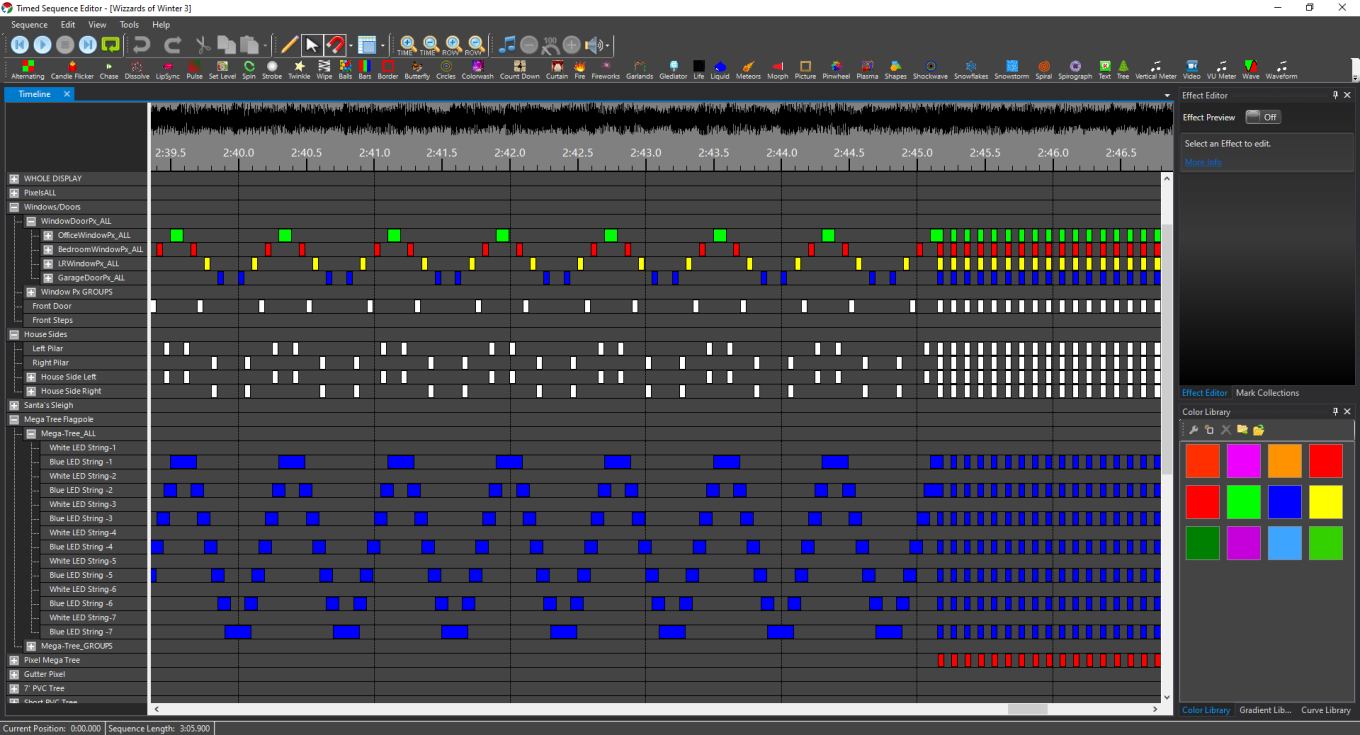 A single 3-minute song can take anywhere from 3 to 6 hours to sequence, even then we might not be satisifed! For each song we have to tell the sequencer what color we want each element, or light bulb, for every moment of the song. Some of the timing is down to the milisecond!